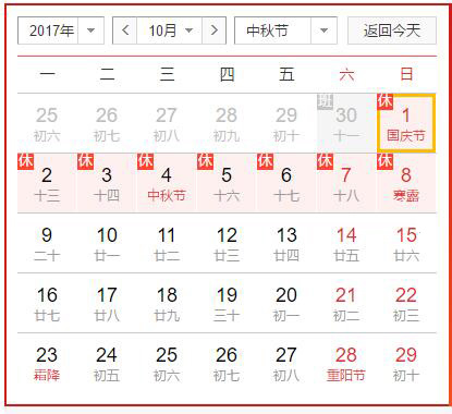 2017年国庆、中秋在同一时间段内故有8天的假期,祝广大同事和客户节日快乐。